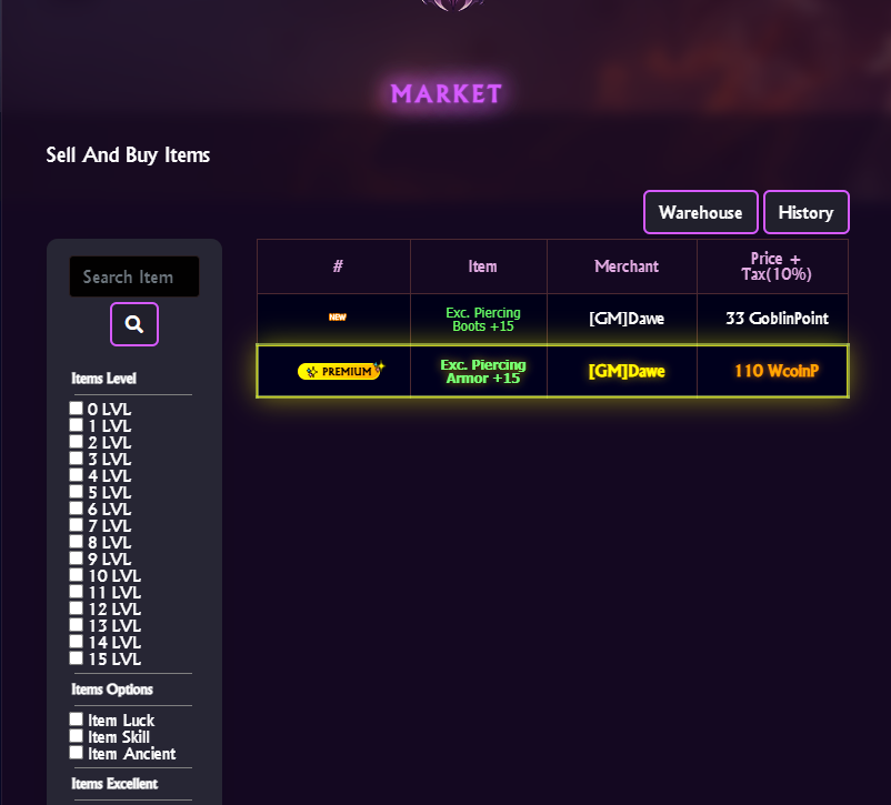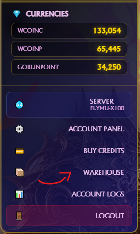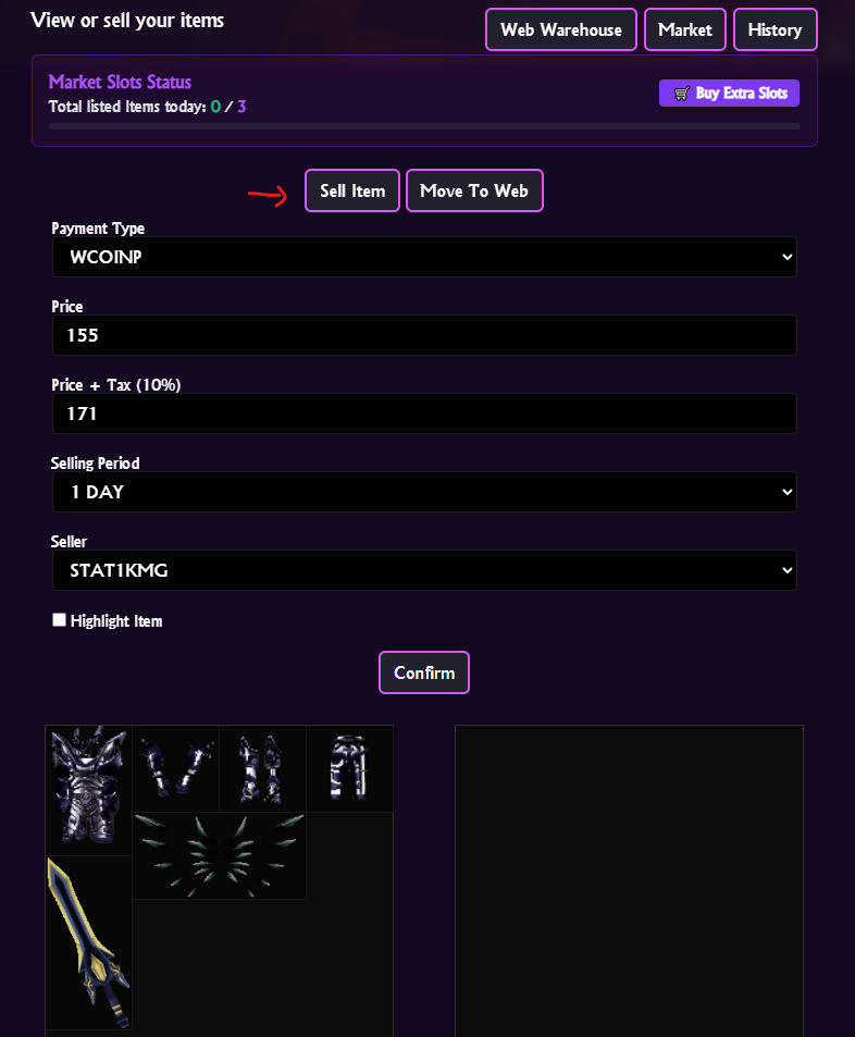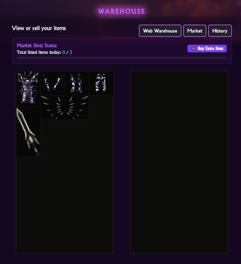 2. You will be redirected to the warehouse page, where you can see your available items to sell, send or view items in your "Web Warehouse", go to "Market", or view your "History" about your currently selling-sold-removed items. You can also purchase "Extra Slots" if you want to sell more items/day on the Market.